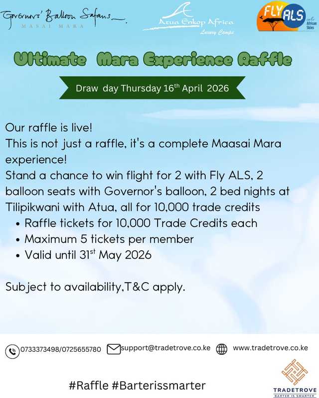 2nts for 2 in a Dbl Tilipikwani/Fly ALS/Governors Balloon Safaris- Ultimate Mara Experience Raffle.
